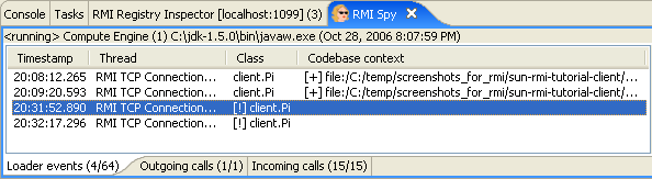 Class loading events tab displays all the classloading events generated by the RMI subsystem. For each event, it displays the standard timestamp and thread name columns and two additional columns that are specific to the loader events tab. Class name columnThe class name column displays the class name that is being loaded. For dynamic proxies, it lists the remote interfaces for which the proxy is being created. If the class could not be loaded the class name is prefixed by an exclamation mark "[!]":